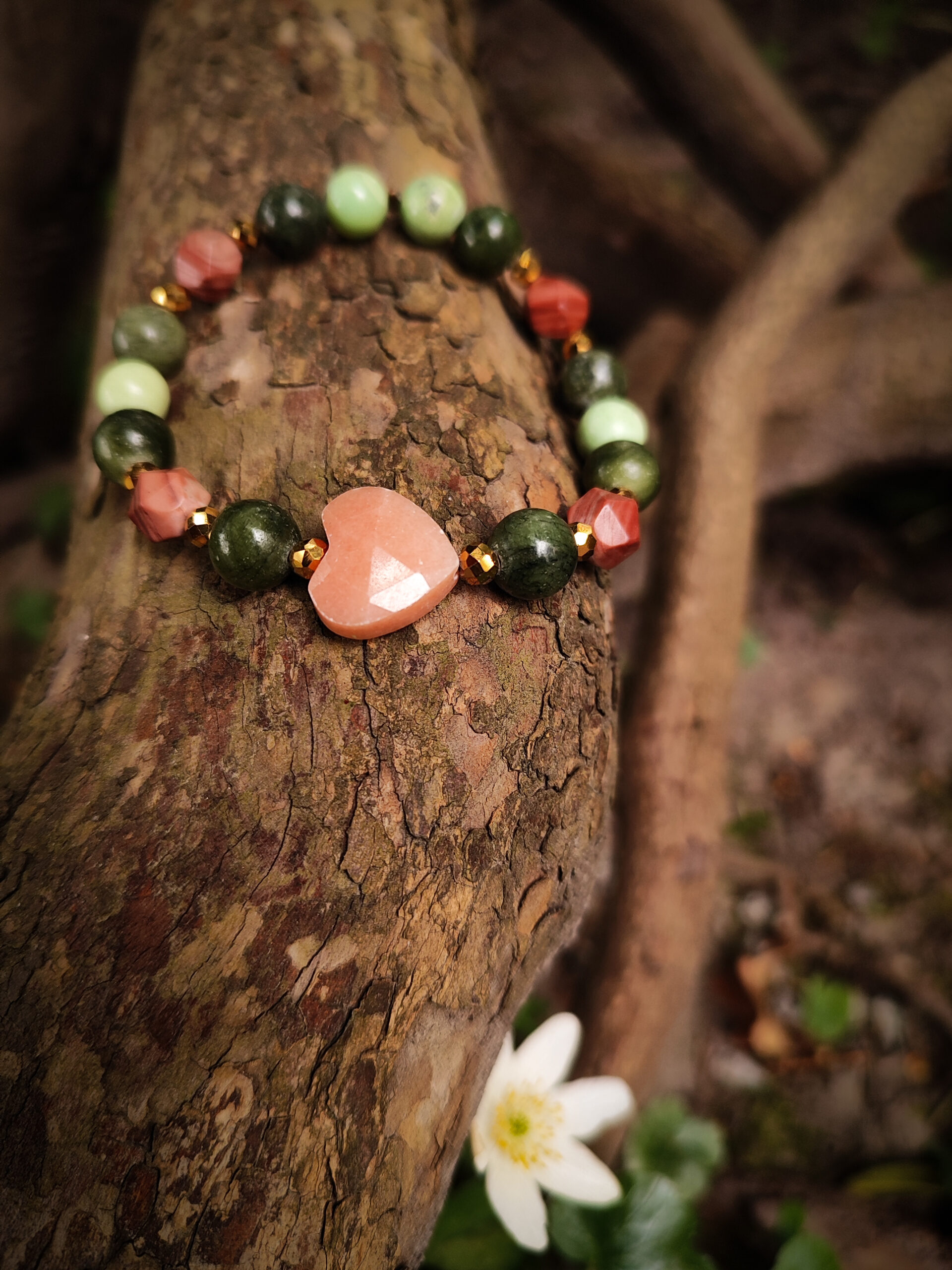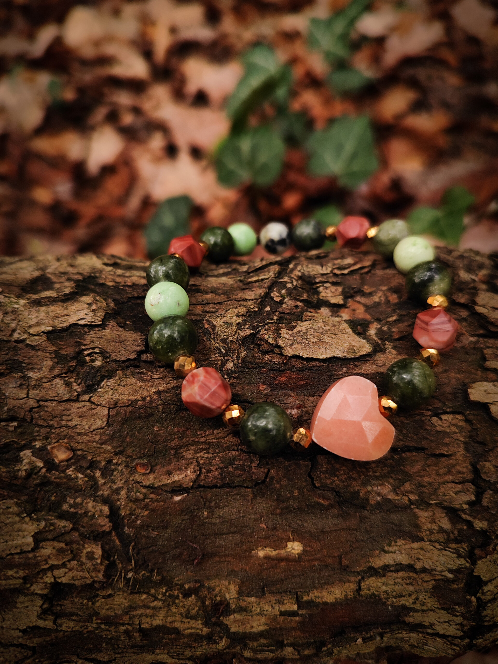 Uwielbiam to połączenie kolorów – ciepłe brzoskwinie w akompaniamencie zieleni. To kwintesencja natury i harmonii. Zabawę kolorem urozmaiciłam poprzez użycie dwóch odcieni serpentynu. Charakteru całości nadają ciosane kulki jaspisu, a serduszko z awenturynu przełamuje całość. Kolory podkreśliłam pozłacanym hematytem.