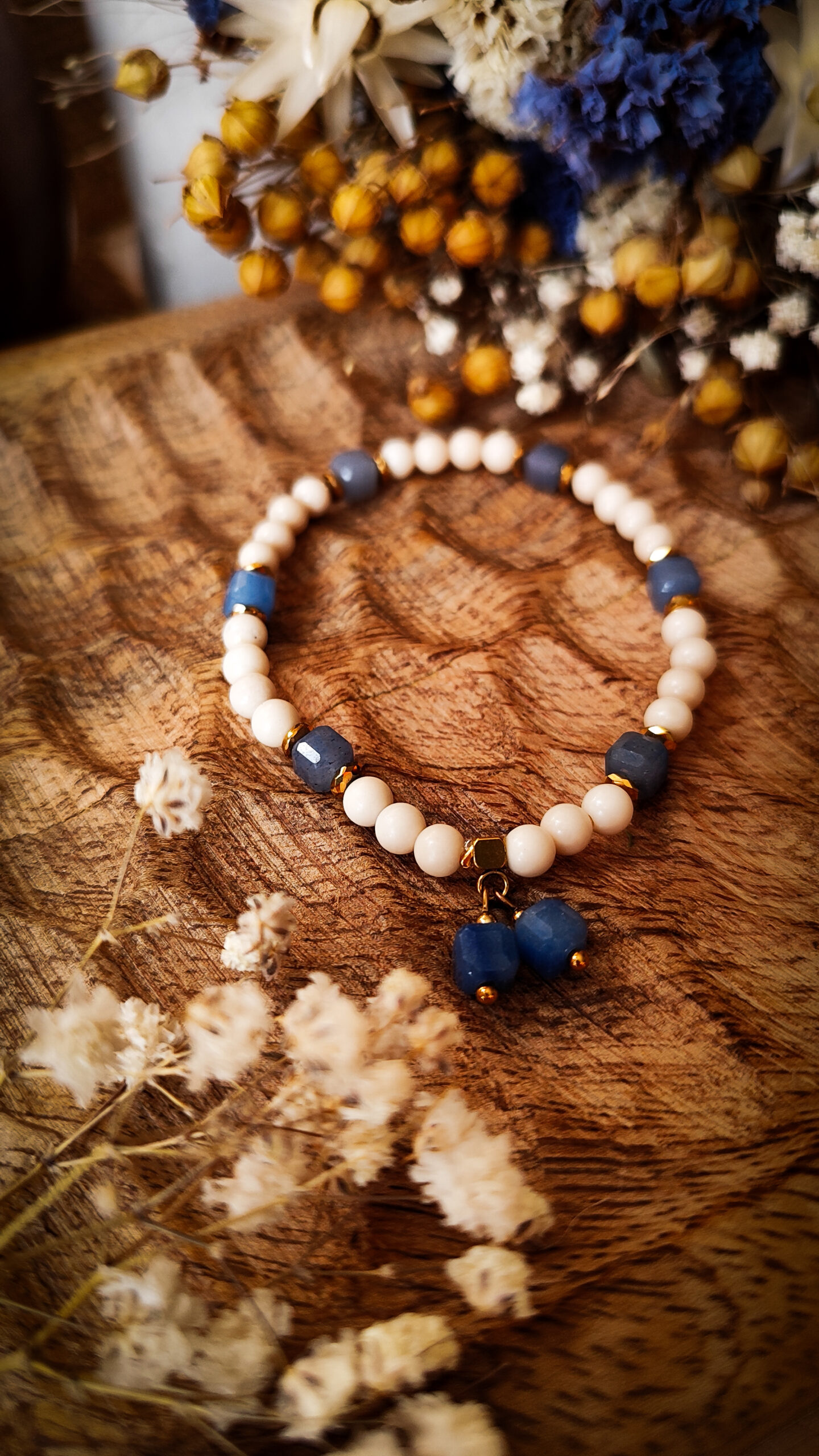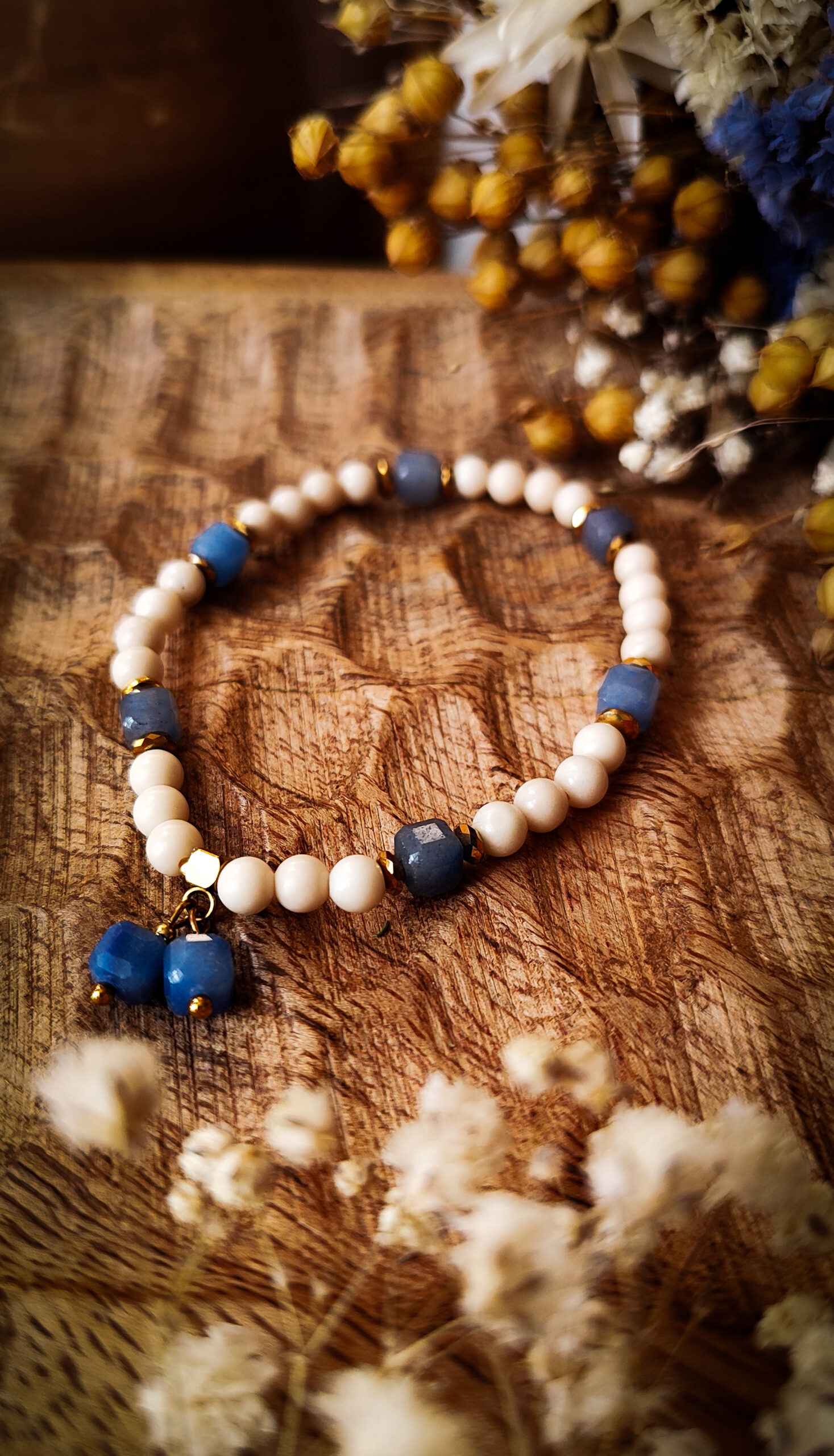 Ta bransoletka przywodzi na myśl spokojne chwile spędzone nad jeziorem. To idealne połączenie delikatnego beżu z subtelnym odcieniem niebieskiego. Całości dopełniają złote, delikatne akcenty.
